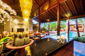 The compound villas that consist of 12 unit private villas with 2 and 3 bedrooms, where each villa completed with all living facilities such as kitchen, open living room, service quarter, swimming pool, pool deck, gazebo and private entrance. The compound villa situated within a beautiful 4,000 m2 lush tropical garden.