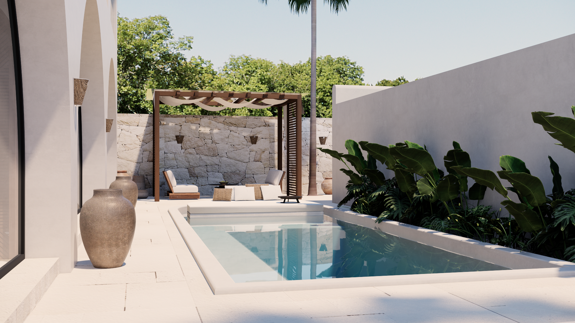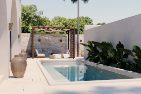 This project consists of 7 villa lots with an area of 1968 sqm, It consists of two types of villas, 2 bedroom villas and 3 bedroom villas. The 2 bedroom villa has an area of 200 square meters consisting of a living room, powder room, kitchen, master bedroom ,master bathroom and swimming pool. As for the 3 bedroom villa has an area of 300 square meters, consisting of a master bedroom, bedroom 1 and 2, living room, storage, kitchen and 3 bathrooms and swimming pool.